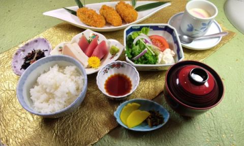 かえで御膳 ¥2,420(税込)カキフライ/刺身(マグロ、白身)/小鉢/サラダ/茶碗蒸し/香の物/ご飯/味噌汁