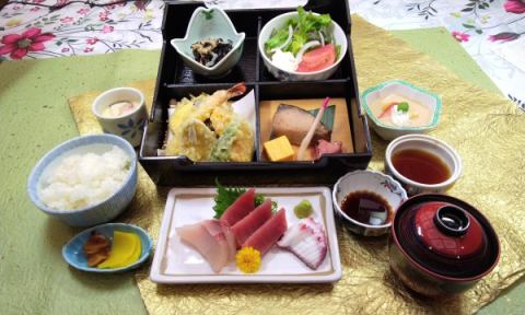花御膳 ¥2,750(税込)前菜/天婦羅(白魚三色揚げ、海老、野菜)/小鉢/刺身(マグロ、白身)/茶碗蒸し/ご飯/味噌汁/甘味