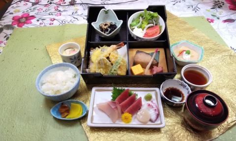 花御膳(花卉套餐)¥2,750(含税)开胃菜/天妇罗(三色炸银鱼),虾,蔬菜)/小碗/生鱼片(金枪鱼),白肉)/茶碗蒸/饭/味噌汤/甜美